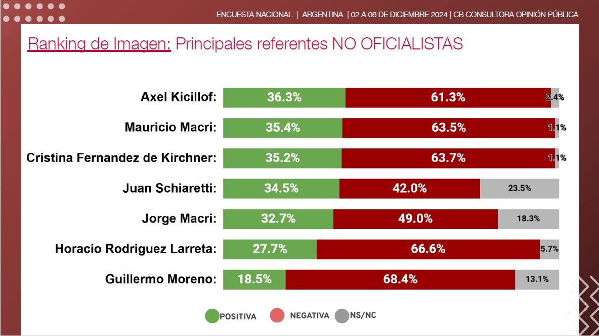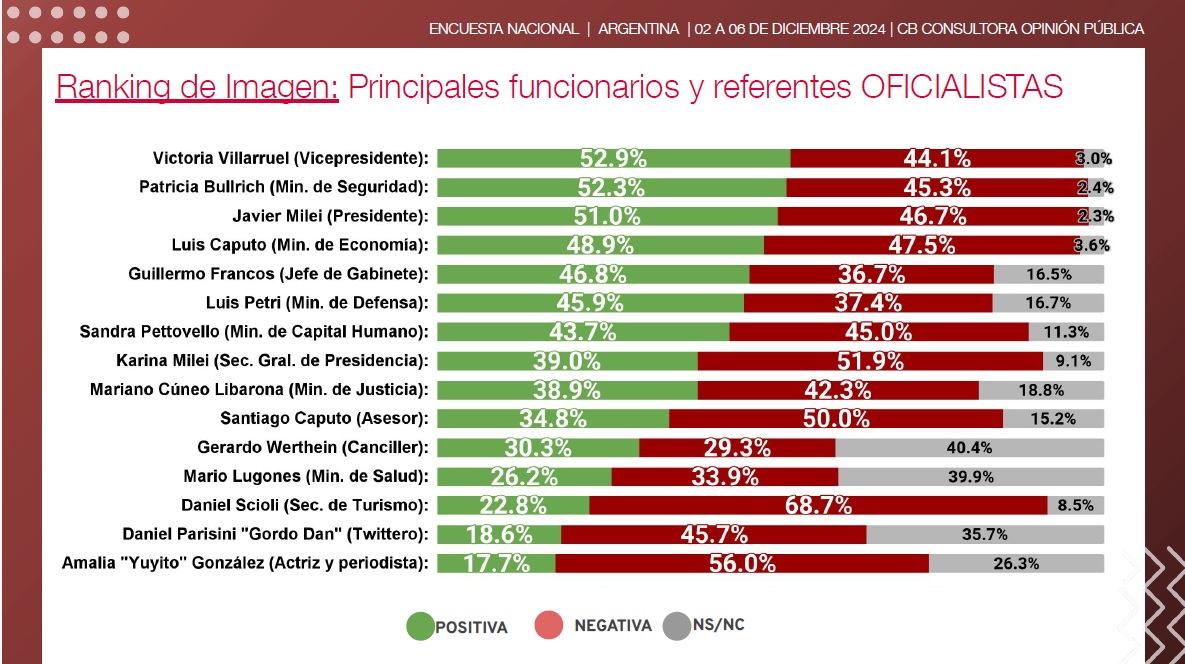 La encuesta también midió a los distintos referentes del oficialismo y en primer lugar se encuentra la vicepresidente Victoria Villarruel con una imagen positiva de 52,9%, le sigue Patricia Bullrich con 52,3% y en tercer lugar Javier Milei con 51%.