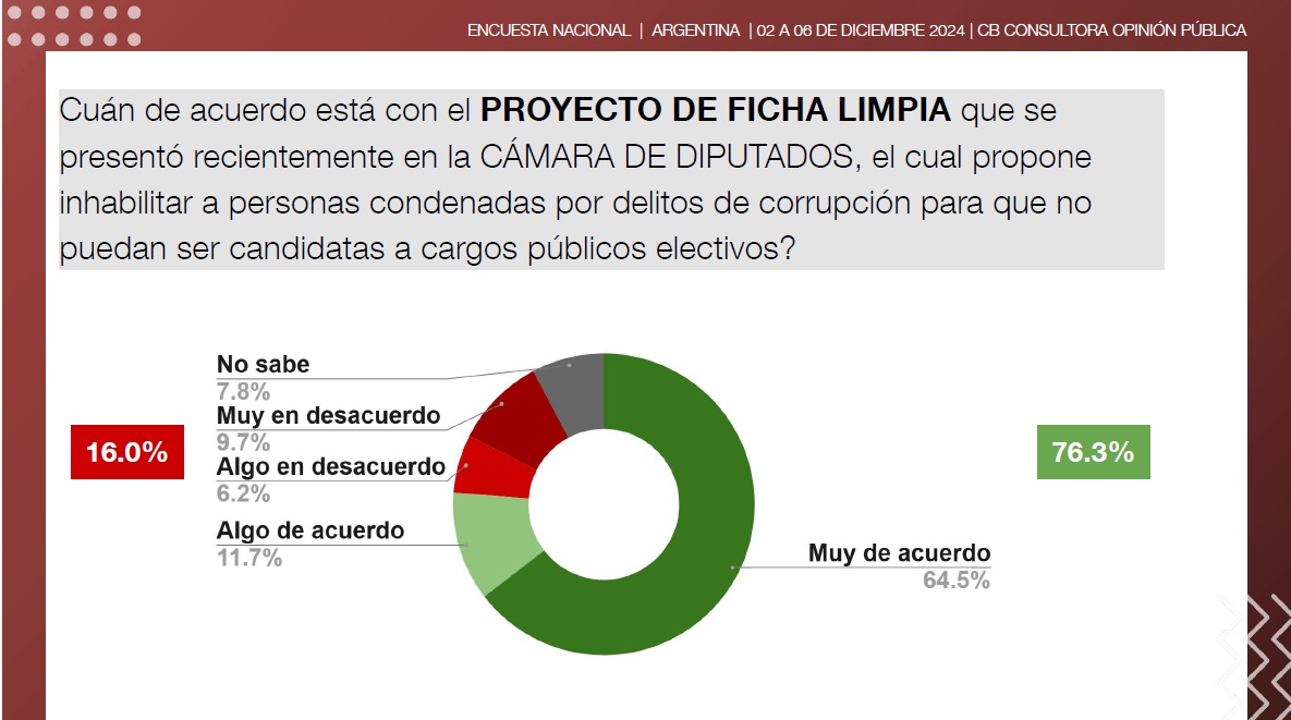 Respecto del proyecto Ficha Limpia, que no logró tratarse en dos oportunidades por falta de quórum y generó distintas versiones sobre posibles pactos políticos, el 76,3% de los encuestados están “muy de acuerdo” con que sea tratado y aprobado.