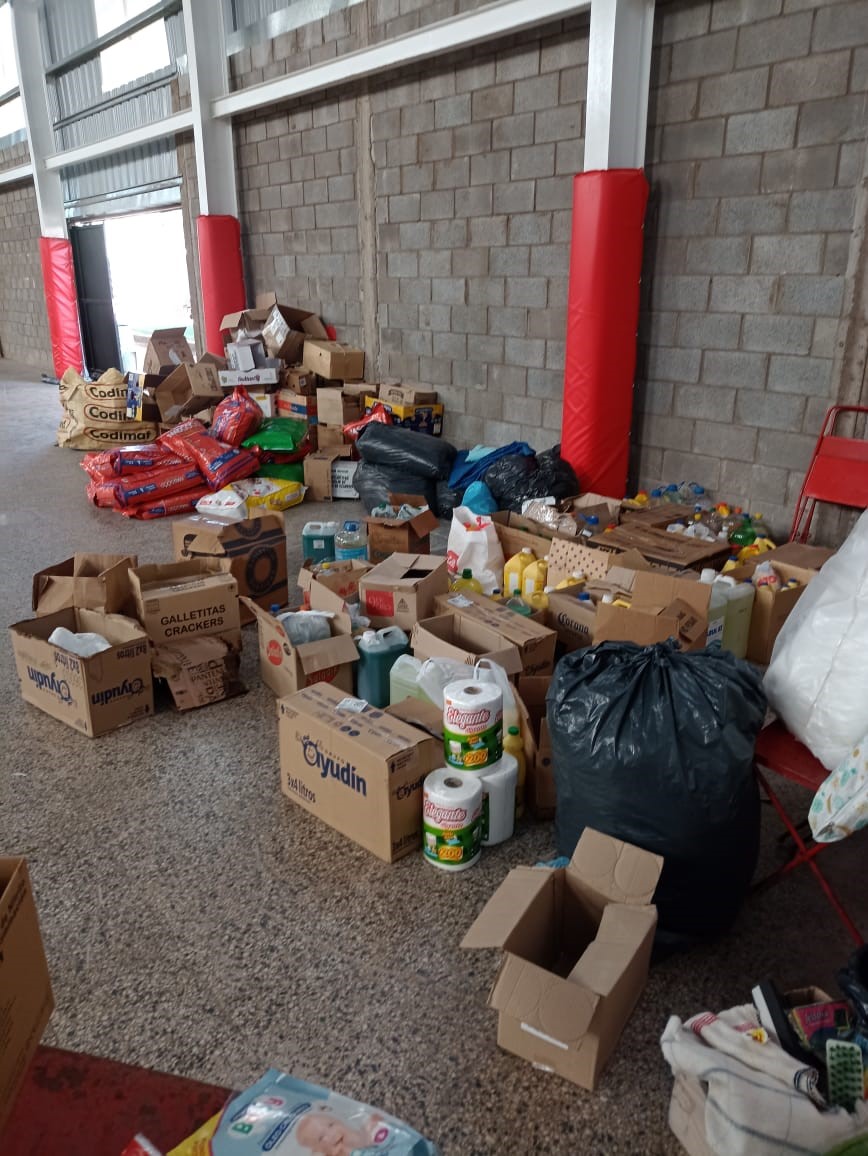 Los amigos y motoviajeros solidarios fueron hasta el Club Sportivo Noroeste a dejar las donaciones. Los voluntarios los estaban esperando, rápidamente comenzó el descenso, se armó una fila para hacer un pasamano y ese lugar comenzó a llenarse de donaciones sampachenses y de localidades vecinas. Mientras tanto, se escuchaba lo sucedido durante la inundación y la gran cantidad de necesidades que aparecieron luego de que el agua bajó en algunos sectores.