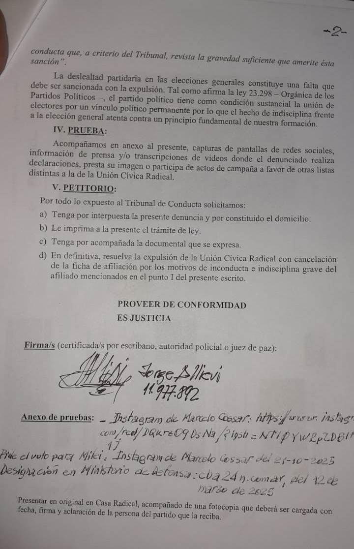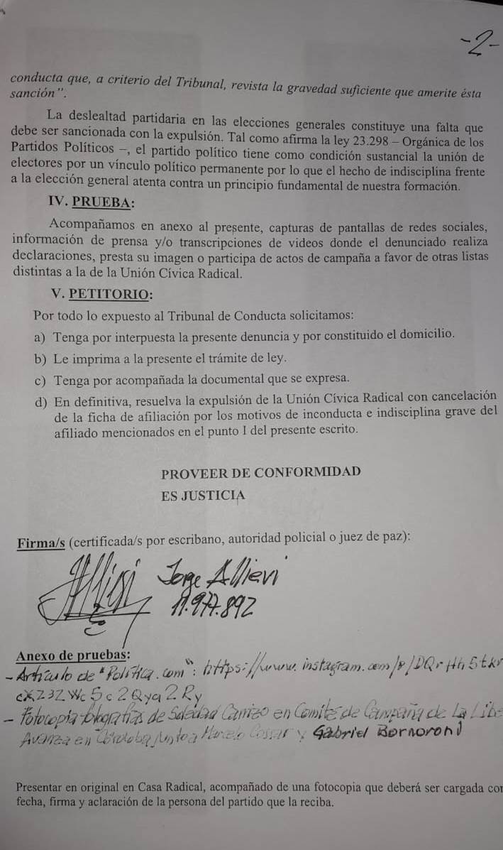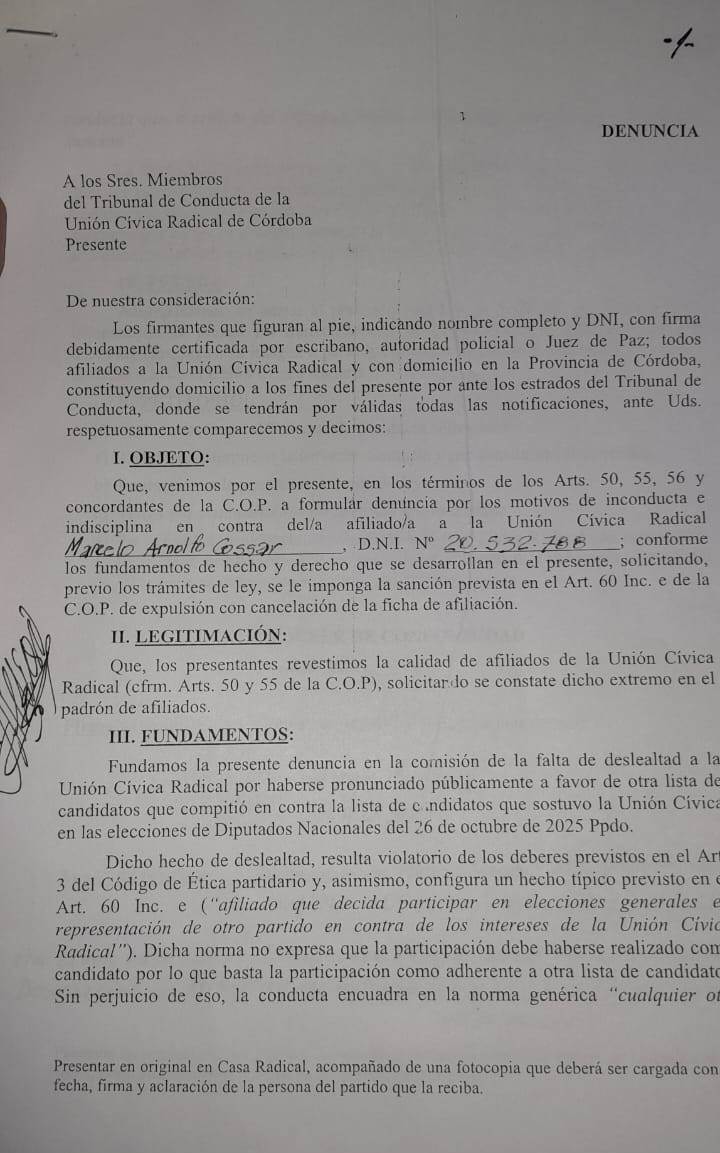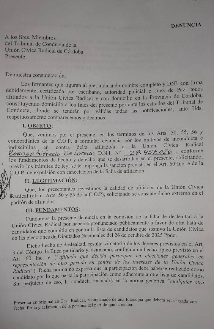“A las presentaciones las hice yo, igual hay otras más, y los que encabezan la entrega de la Unión Cívica Radical son dos diputados, De Loredo y Carrizo, y un ex intendente, Cossar, que cumple funciones en el ministerio de defensa , como otros intendentes que se sumaron a la política del gobernador Llaryora. El radicalismo tiene que decidir si quiere seguir siendo UCR o si quiere ser simplemente, una parte del gobierno nacional”, agregó Allievi.
