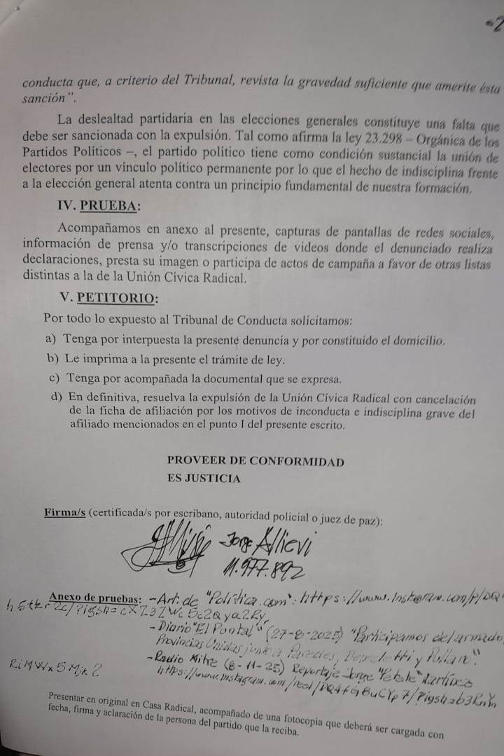 Jorge Allievi, ex presidente del Congreso Provincial de la UCR de Córdoba, junto a un grupo de afiliados hicieron una presentación al Tribunal de Conducta del partido, solicitando la expulsión de dirigentes como Rodrigo De Loredo, Soledad Carrizo, Marcelo Cossar e intendentes que fueron parte de la lista o adhirieron a Provincias Unidas. “El radicalismo está pasando por un momento muy difícil, fundamentalmente en nuestra provincia. Hay algunos que piensan que la política del presidente Milei es la acertada, y otros sostenemos que estamos en la vereda totalmente opuesta, el radicalismo no tiene nada que ver. El partido nació combatiendo a gobiernos de ultra derecha y queremos volver a recuperar la esencia de la UCR”, dijo Jorge Allievi, en diálogo con FM IDENTIDAD y ARCO IRIS TV.