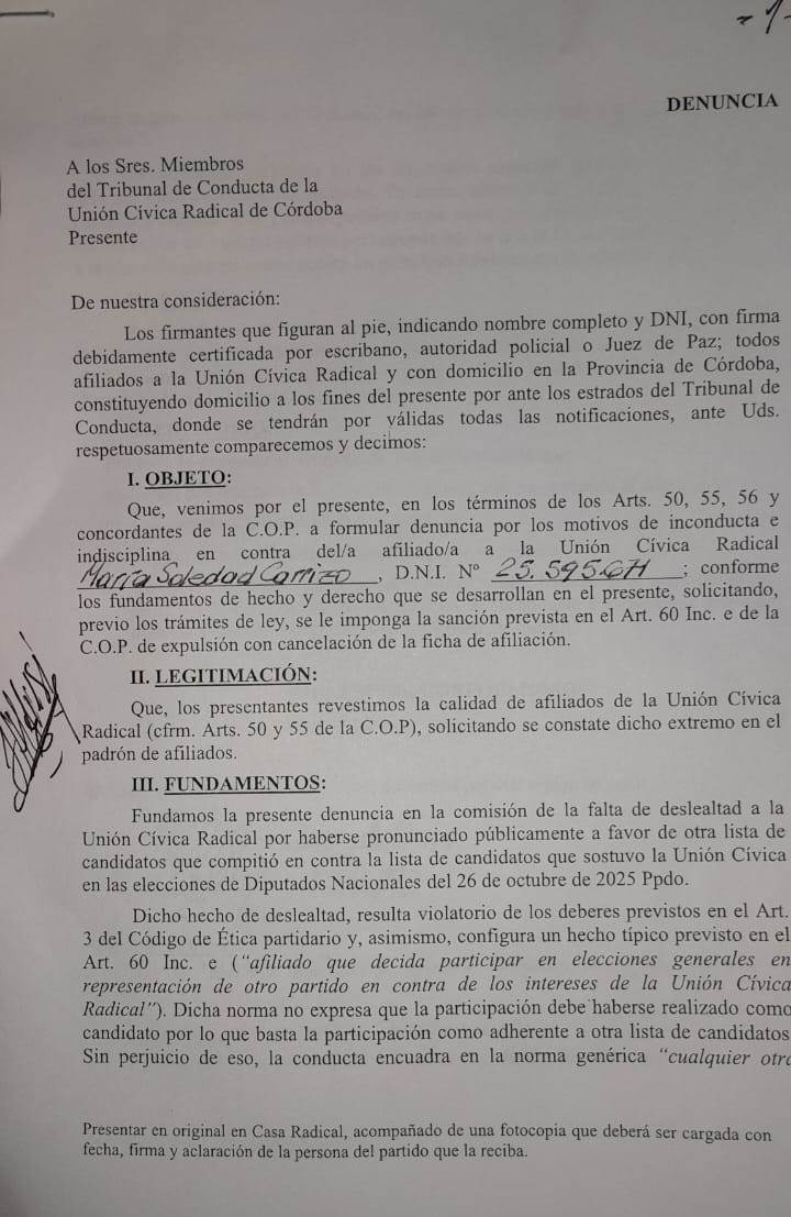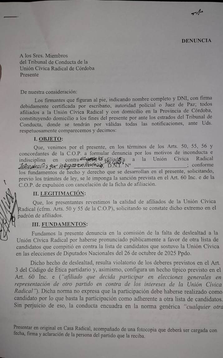 Afiliados del radicalismo cordobés piden que actúe el Tribunal de Conducta del partido, por la actitud de reconocidos dirigentes e intendentes en las últimas elecciones.