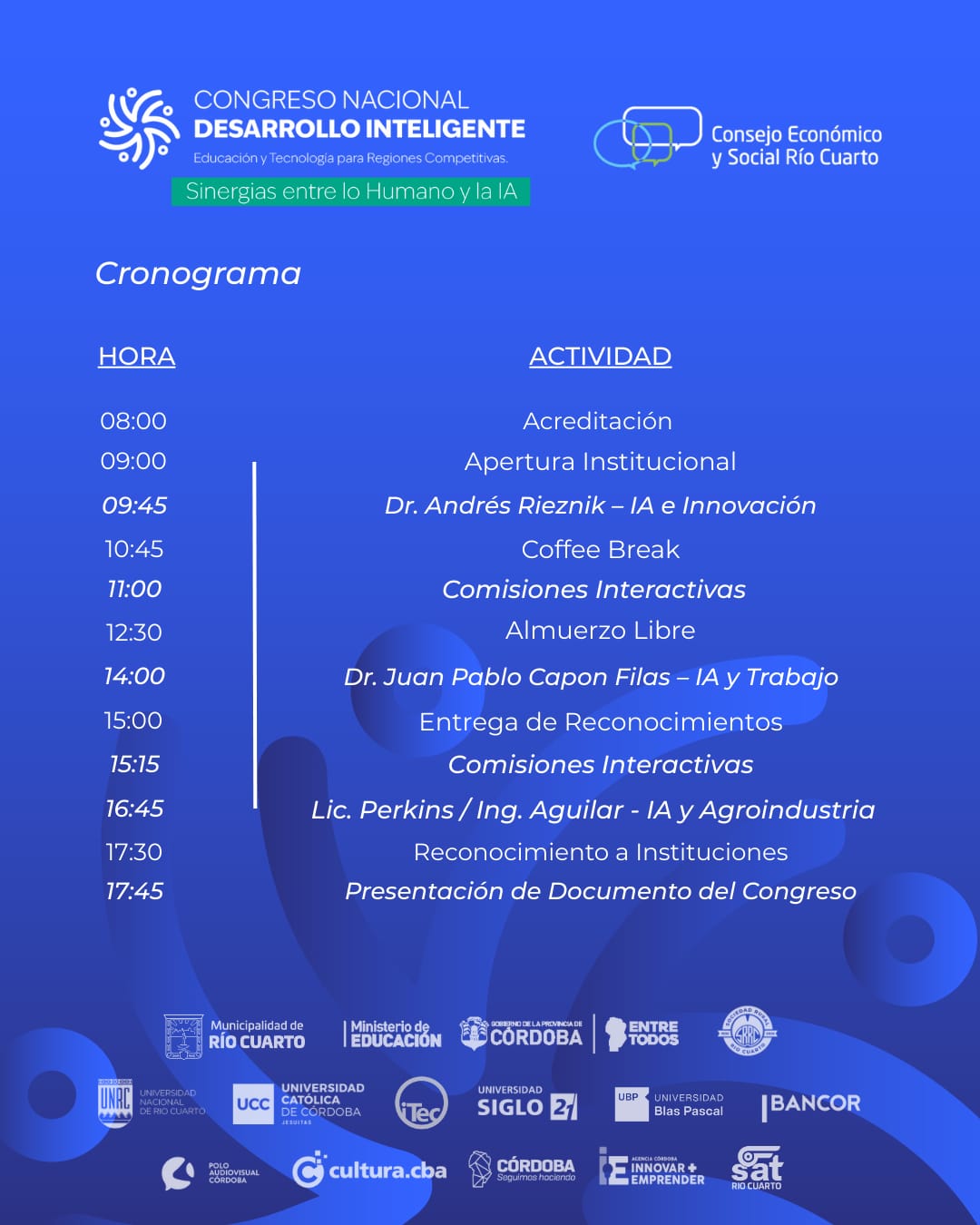 Los conferencistas serán el Dr. Andrés Reiznick que disertará sobre IA e innovación, el Dr. Juan Pablo Capon Filas cuyo tema será IA y trabajo y el Lic. Perkins y el Ing. Aguilar que se referirán a la IA y Agroindustria.